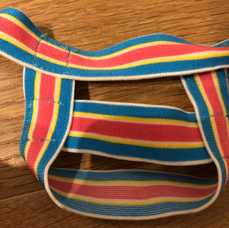 It's a simple, elastic harness consisting of a thin waistband and at the center, extra straps for the prosthetic. There are no leg straps involved in this harness. You can choose from multiple dual-color options and this one was a blue and pink version.