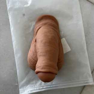 The Fusion is surprisingly big. The shaft is thick and the ballz have some volume too. Fusion’s uncut which I always love. In a way, it looks very sculpted with symmetrical balls and lots of skin folds/wrinkles. The colour is vibrant. The back is slightly bent and there’s two indents there which I first feared would be uncomfortable but it’s not. I don’t notice it much if at all. As all Axolom products, it’s a smooth, silky packer. It’s a bit heavy, close to the Monsieur Wiggle. Overall, I like the aesthetic.