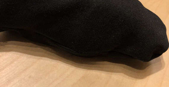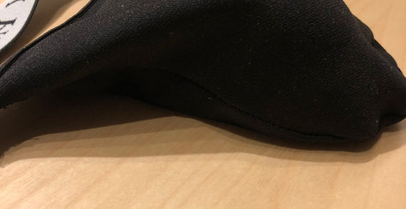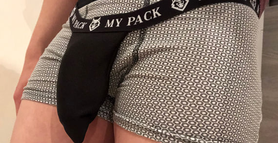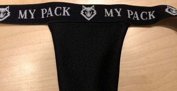 This navy blue Gender Jockstrap is from TranStore Brasil. It's basically a jockstrap but with an o-ring in the crotch area for your prosthetic. Beneath the hole, there's a short, elastic band to keep the shaft in place.